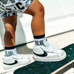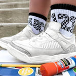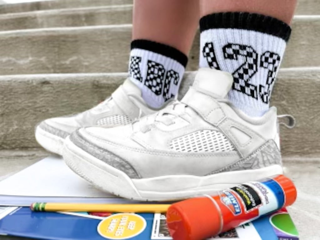 Sizes Infant/XXS, Extra Small, Small + Medium have logo grips on the bottom of the feet and size large have a stitched logo on the bottom of the feet.