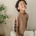 Get your little athlete ready for game day with this playful long sleeve! Featuring a bold football graphic on the back and "ATHLETE" printed down the sleeve, it’s made from soft, stretchy fabric that moves with every throw and touchdown celebration. Perfect for active kids who love to play hard and look great doing it.