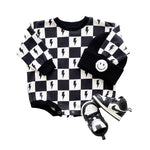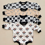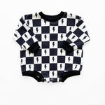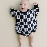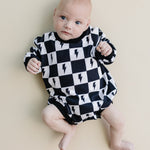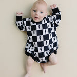 Introducing the Charcoal Bolts bubble romper—a perfect blend of vintage charm and modern style. The dusty black printed lightning bolts add a cool, edgy touch to this long sleeve romper. Crafted from a soft, stretchy fabric of 95% cotton and 5% spandex, it ensures all-day comfort for your little trendsetter.
