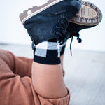Sizes Infant/XXS, Extra Small, Small + Medium have logo grips on the bottom of the feet and size large have a stitched logo on the bottom of the feet.