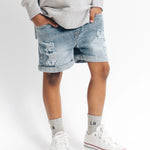 Little Bipsy - Meet your new favorite denim shorts. Our Distressed Denim Shorts make any outfit look effortlessly cool. These shorts were designed with an elastic waistband + functioning drawstring for easy dressing, as well as trendy distressing + rolled leg cuffs for chill warm-weather style.