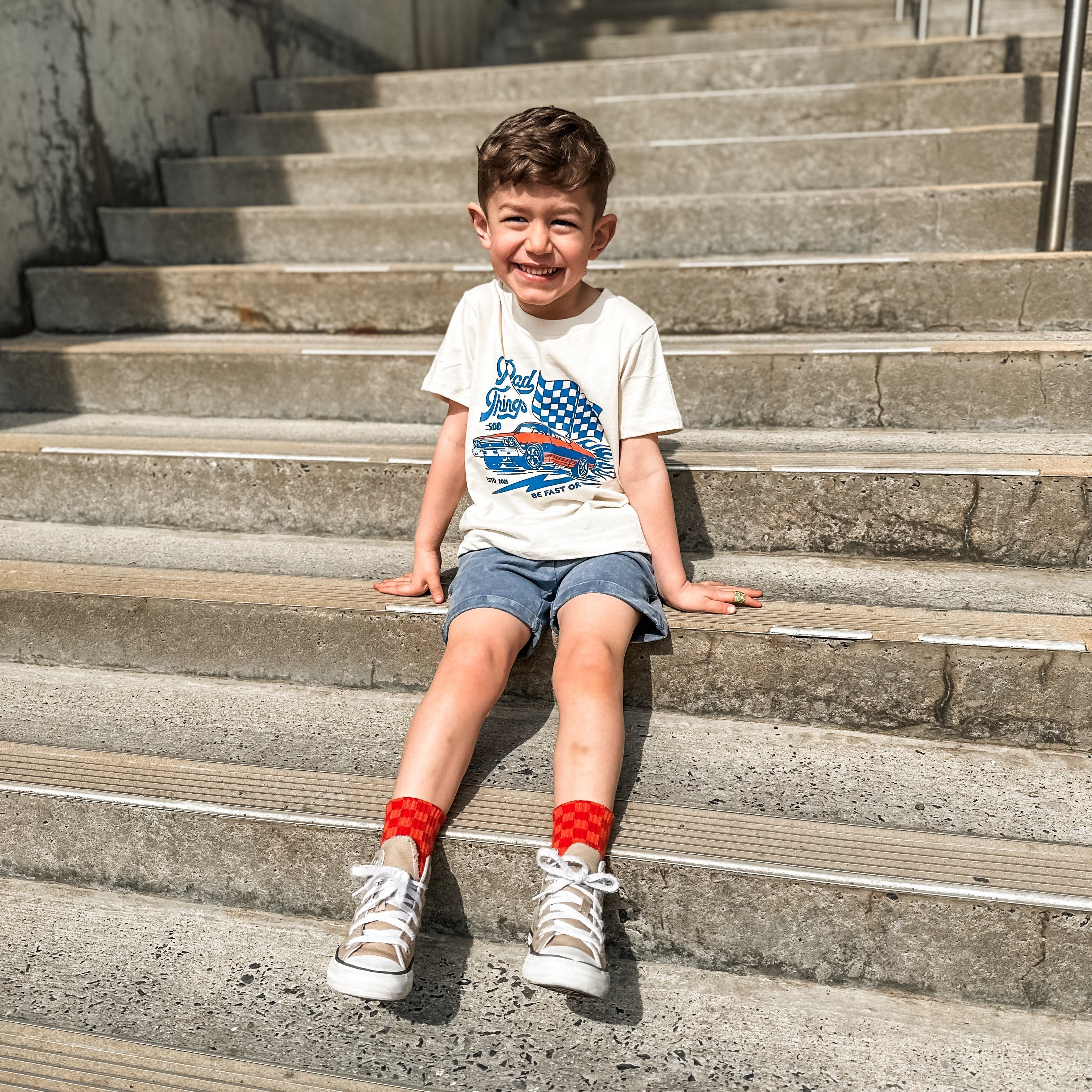 Drive fast or be last, it's the Rad Things 500. A front-only graphic tee made of 100% organic cotton. This graphic tee was inspired by our NASCAR roots and America's greatest race of the season - the Daytona 500.